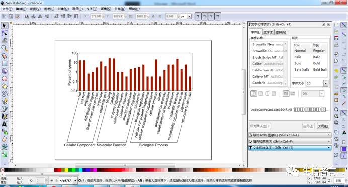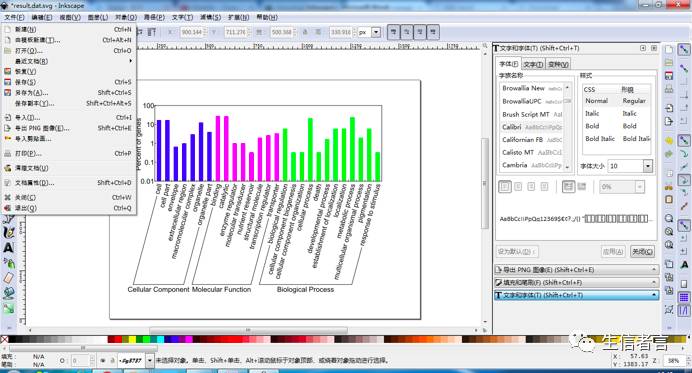 ,首先按住“shift”键进行多项选择“cellular component”相对应的柱状,然后单击调色区选择填充颜色,以此类推完成”molecular function” 和”biological process” 图像填充,最终效果图如下所示: