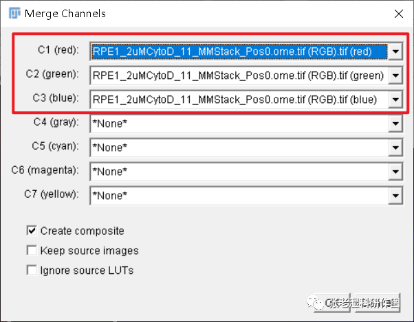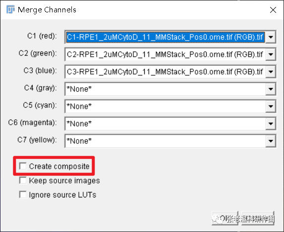 在Image-Color-Merge Channels的时候,要取消勾选Creatie composite框。否则将带有composition属性,存出来的图片默认会展示最上层的红通道,也就是你存的tiff格式图片是红色的。