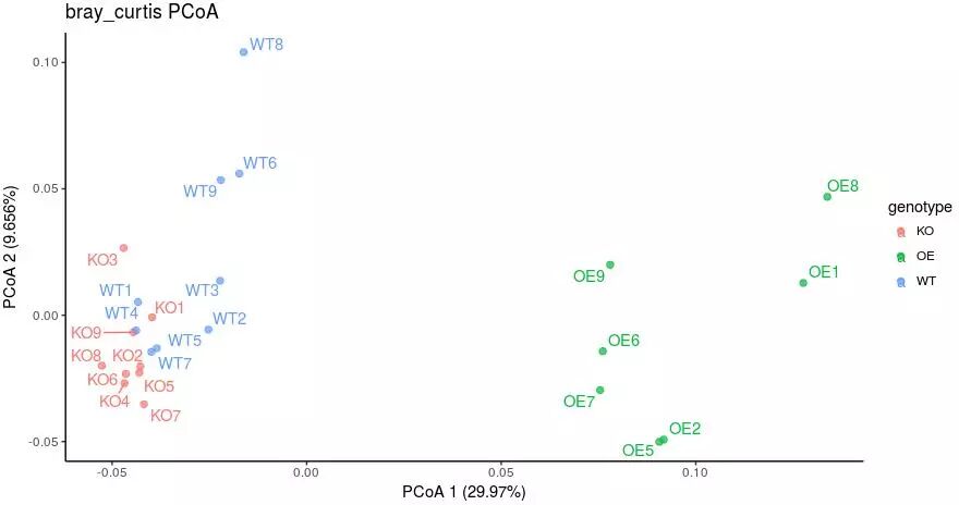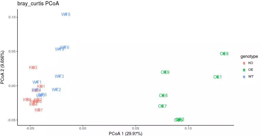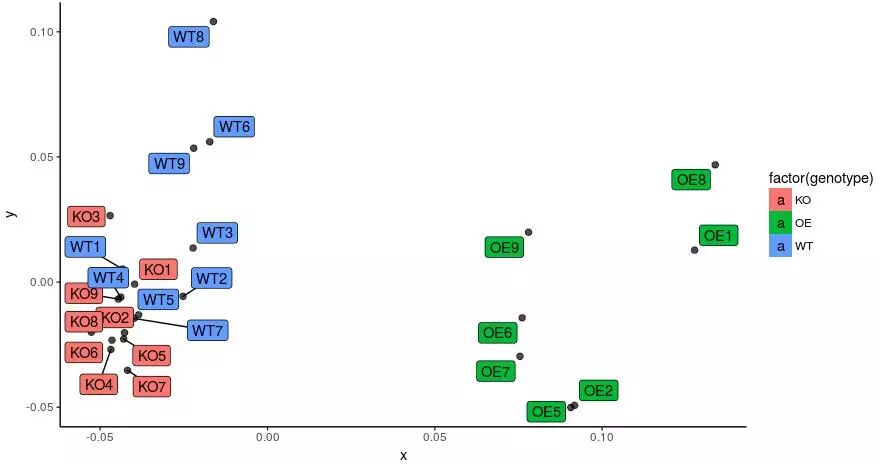 而在样品比较、样品筛选时又必须看清这些点名字,用于筛选掉一些记录错误、未报抗生素使用或隐性疾病等异常样品。ggplot2的辅助包ggrepel就是专门处理遮盖问题的专家。有了人类可读的可视化结果,在我们下游分析、样品筛选、异常样品鉴定更加方便高效。