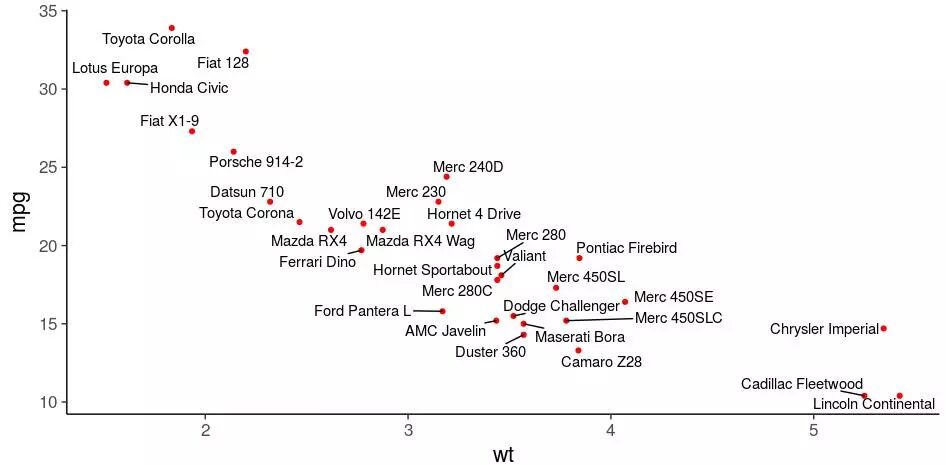 geom_text_repel(aes(wt, mpg, label=rownames(mtcars)))+