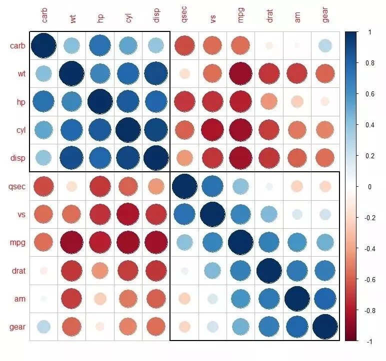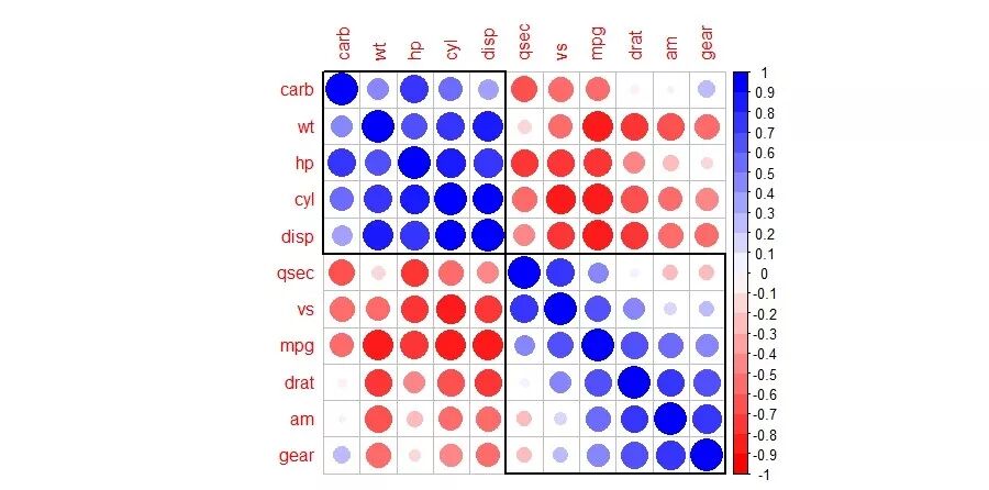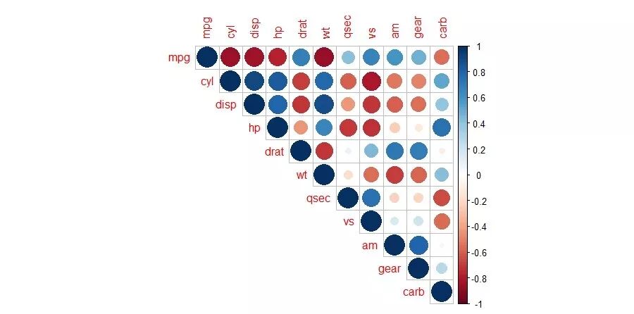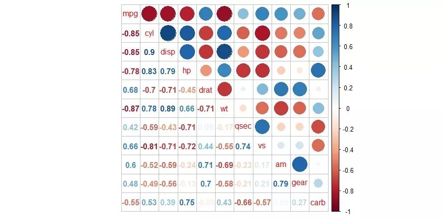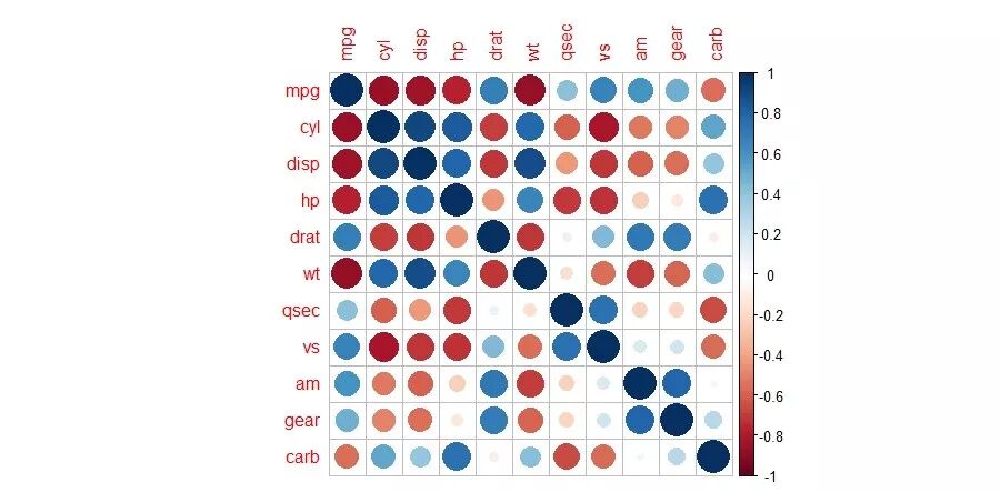 我们library加载包,使用cor计算内部数据mtcars汽车数据列间相关系数矩阵,再绘图。
