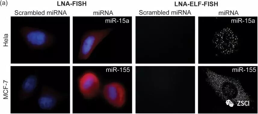 针对miR-15a和miR-155设计荧光探针,检测miRNA定位和相对表达强度。