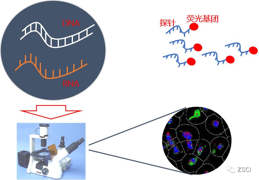 ①使用荧光标记的探针进入细胞,在互补配对、退火形成双链的基础上,将可与该探针结合的核酸(DNA.RNA)标记上荧光并显示位置。