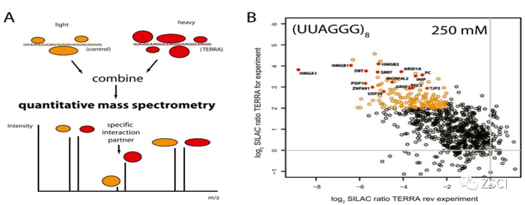 生物素标记的TERRA将细胞内可与之结合的蛋白质拉下来,蛋白纯化后进行质谱,得到可结合TERRA的所有蛋白的信息。