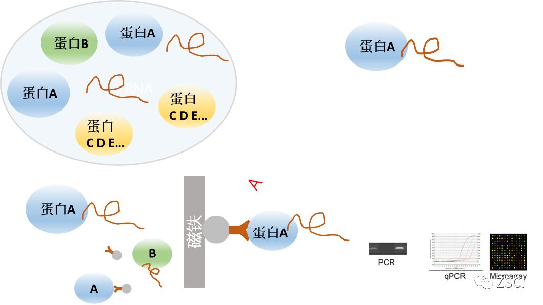 ②利用抗体特异性结合目的蛋白的特征,将细胞内蛋白质-RNA 复合物沉淀下来,对蛋白-RNA复合物中的RNA 进行检测的方法。