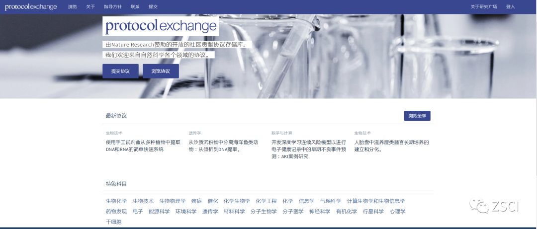 Protocol Exchange是Nature Protocols赞助的开放性平台,由作者直接发布在Protocol Exchange上,并免费提供给科学界使用和评论。涉及领域多达35个,包括生物化学、生物物理学、化学、分子医学、分子生物学、神经科学等。