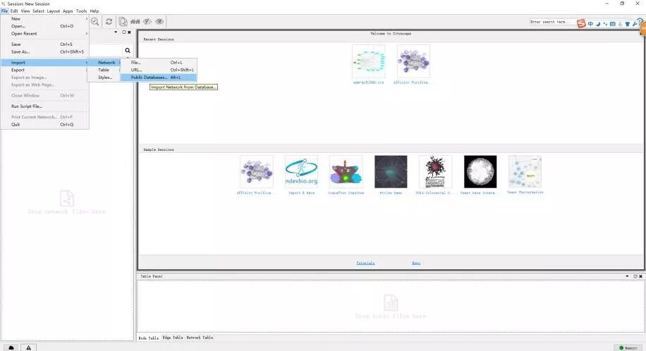 2. 安装完成后,开始导入蛋白互作网络,选择从公共数据库导入网络。打 开File-Import-Network–Public_Database。