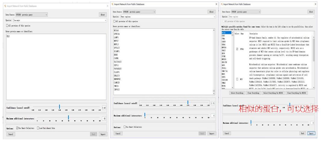 3. 选择Data Sourse为STRING:protein query,然后输入需要富集的蛋白。输入一个蛋白,则会导入与这个蛋白相关的相互作用;如果输入多个蛋白,则会导入多个蛋白间的相互作用。输入蛋白时,可能会和STRING数据库匹配到多个相似的蛋白,可以自行进行选择。Confidence Score代表蛋白间相互作用强弱,所设置的cut–off值即为所能接受的最低值。(low=0.15; medium=0.4;high=0.7;highest=0.9)。Maximum是为互作蛋白设置的最大值。