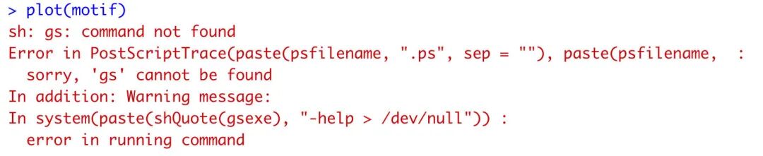 brew install ghostscript,但是你真的不知道homebrew有多慢?;因为brew install基于git,github在国外的网络,所以这个断断续续的搞了一个多小时;之后安装完我直接试了plot(motif),结果这时候又报错了,网络上是这样说的: