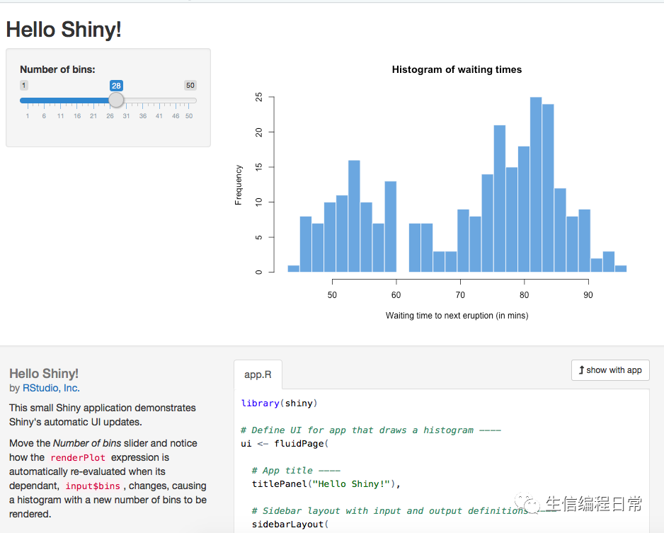 library(shiny)#直接展示内置的实例runExample("01_hello")