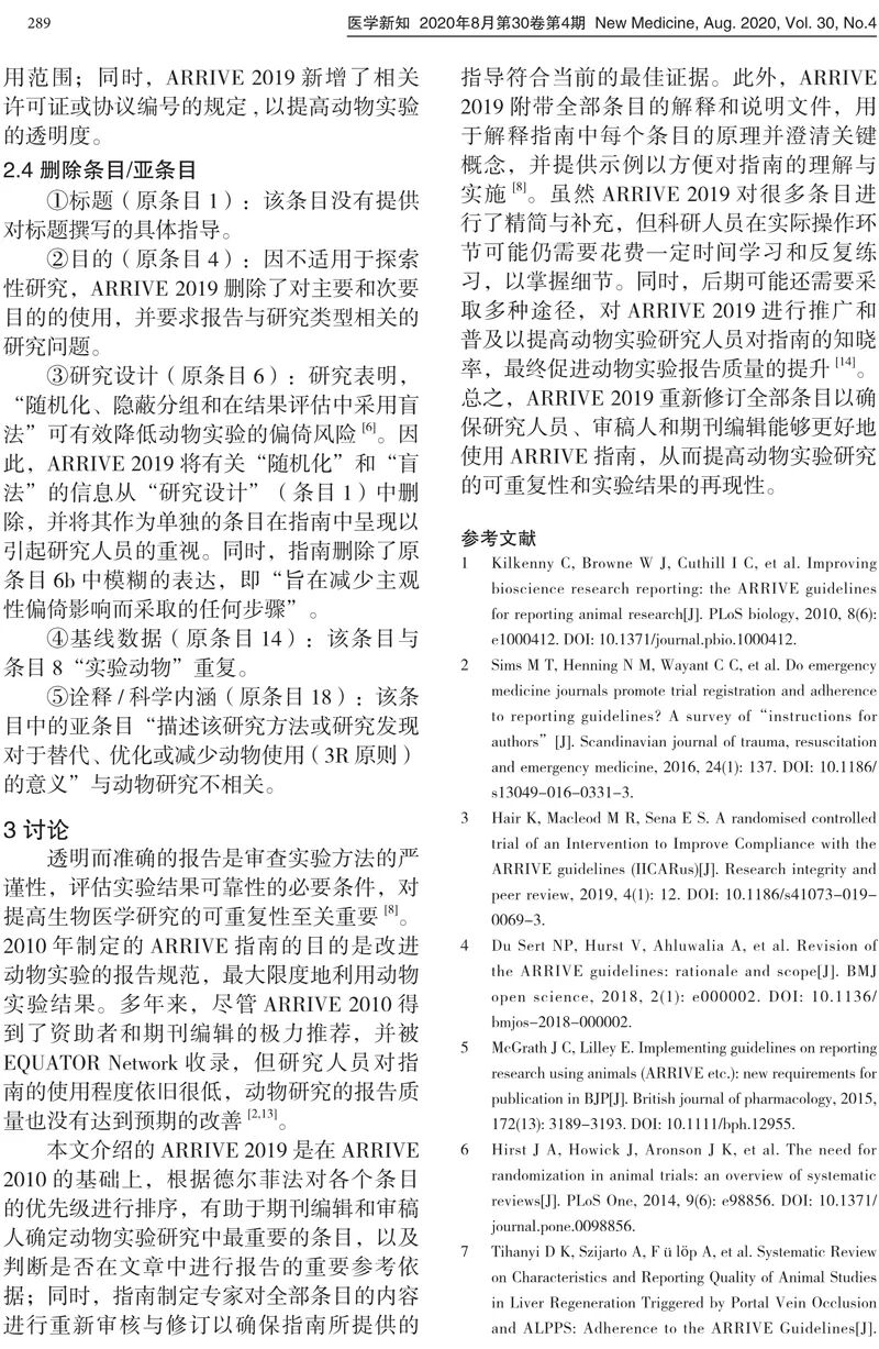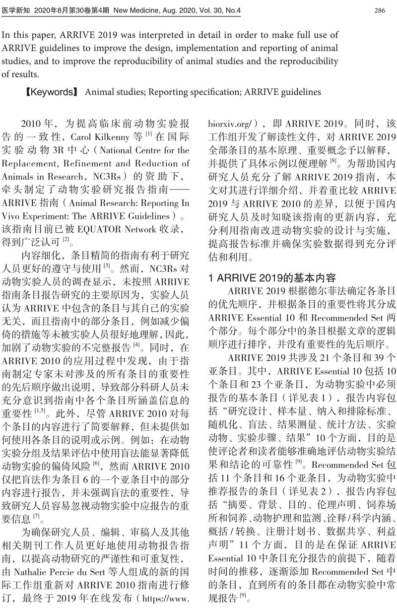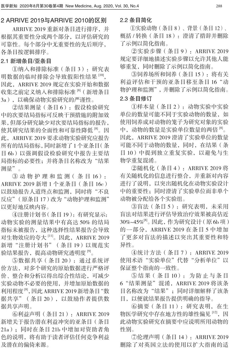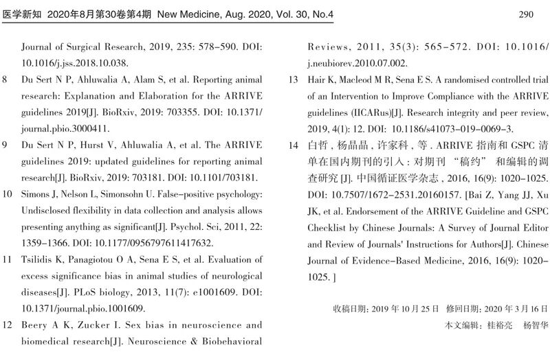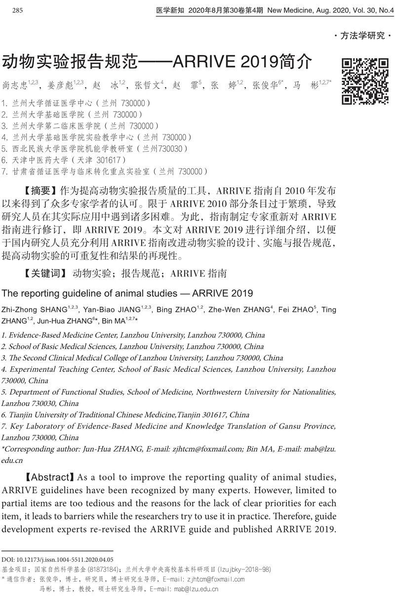 Shang ZZ, Jiang YB, Zhao B, Zhang ZW, Zhao F, Zhang T, Zhang JH, Ma B. The reporting guideline of animal studies —— ARRIVE 2019[J]. Yixue Xinzhi Zazhi, 2020, 30(4): 285-290. DOI: 10.12173/j.issn.1004-5511.2020.04.05.[Article in Chinese]
