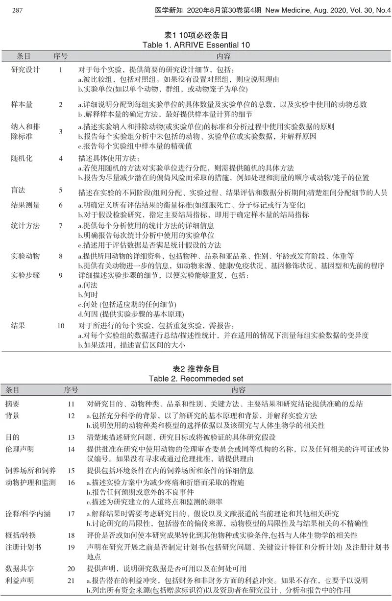 内容细化,条目精简的指南有利于研究人员更好的遵守与使用[3]。然而,NC3Rs对动物实验人员的调查显示,未按照ARRIVE指南条目报告研究的主要原因为,实验人员认为ARRIVE中包含的条目与其自己的实验无关,而且指南中的部分条目,例如减少偏倚的措施等未被实验人员很好地理解,因此,加剧了动物实验的不完整报告[4]。同时,在ARRIVE 2010的应用过程中发现,由于指南制定专家未对涉及的所有条目的重要性的先后顺序做出说明,导致部分科研人员未充分意识到指南中各个条目所涵盖信息的重要性[1,5]。此外,尽管ARRIVE 2010对每个条目的内容进行了简要解释,但未提供如何使用各条目的说明或示例。例如:在动物实验分组及结果评估中使用盲法能显著降低动物实验的偏倚风险[6],然而ARRIVE 2010仅把盲法作为条目6的一个亚条目中的部分内容进行报告,并未强调盲法的重要性,导致研究人员容易忽视动物实验中应报告的重要信息[7]。