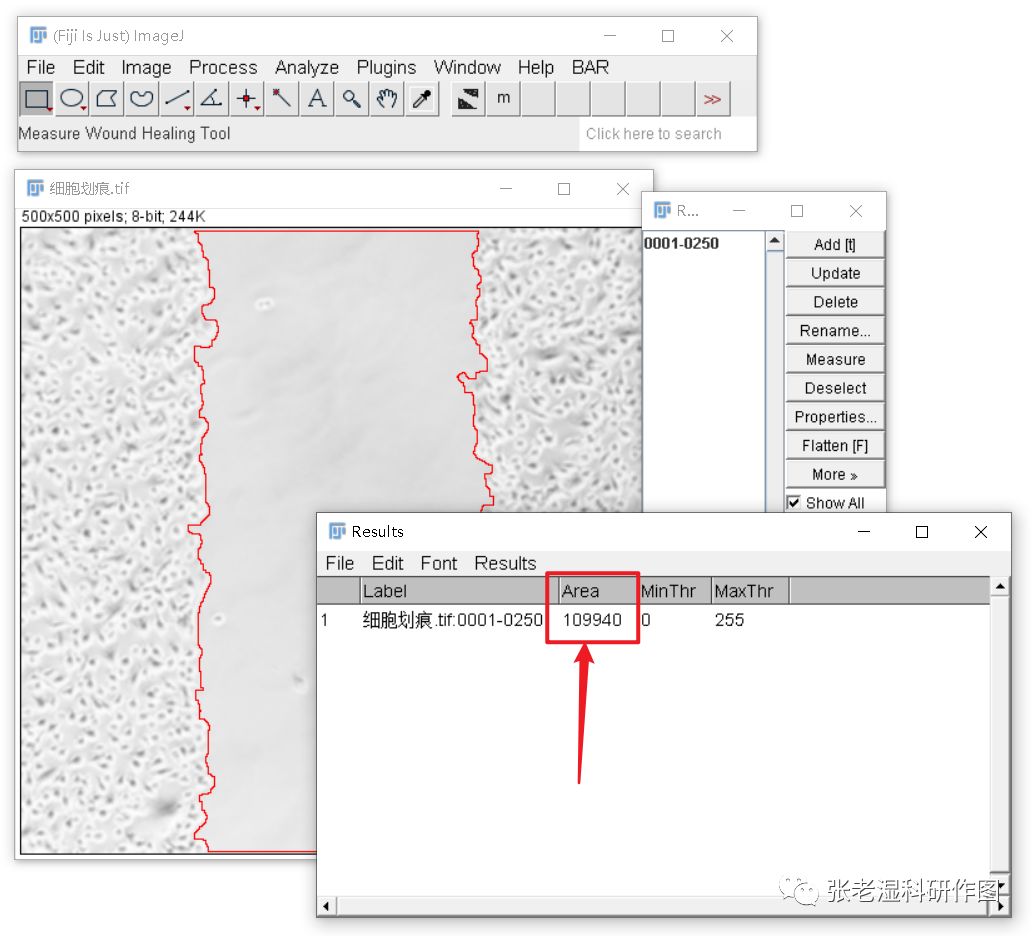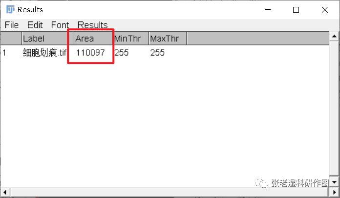 ignore spatial calibration(忽略标尺校正):这里没有校正,选不选都无所谓;在做了标尺校正的时候,视情况而定是否需要,一般不勾选。 再次点击m图标,这回划痕面积会大一点,而且选区轮廓线也更贴近细胞一点;