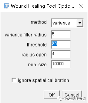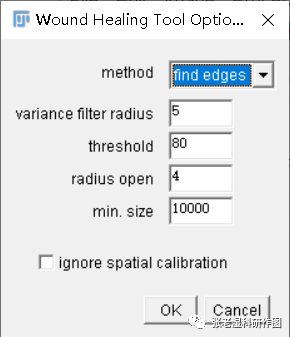 第2步和第3步总的效果跟使用Process-Sharpen,然后Image-Adjust-Brightness/Contrast提高对比度差不多;个人认为第2步和第3步的目的是强化细胞边缘,便于与划痕(背景)区分开来,但往往会造成最后测量的划痕面积稍微偏小;大多数情况下可以不做,直接第4步就行,但是一系列图片中要么都别做,要么都做。不少教程都有这两步,这里稍作说明。