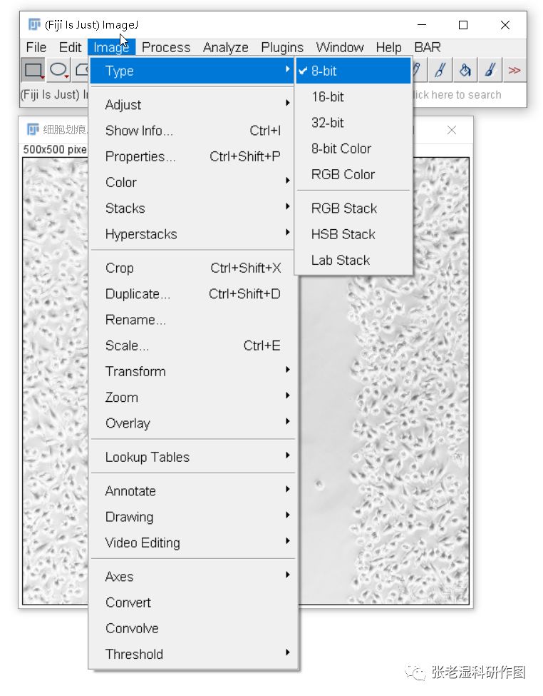 6、然后把打开的图片,改成8 bit:Image-Type-8 bit,点击m图标即可;