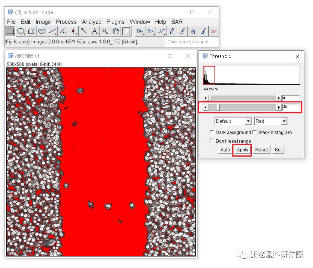 5、Image-Adjust-Threshold,通过调节阈值,使得蒙版填满划痕;这一步不能直接用Threshold来构建选区,因为两侧细胞内部可能会存在空洞(下图细胞区域的红色点),这些空洞不属于细胞划痕的面积,要排除在外,但是会被Threshold自动选中。接着点击Apply进行二值化处理,结果使得图片非黑即白;