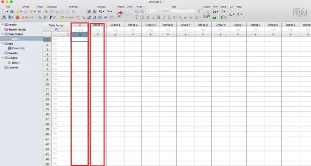 3. 将两变量的数据分别键入X栏和GroupA栏(第一列Y栏)中