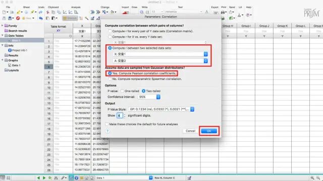 6. 在Resutls下的Correlation of Data 1 下的Tabular results即为pearson相关性分析结果,包括相关系数r、相关系数r的平方、置信区间、P值等