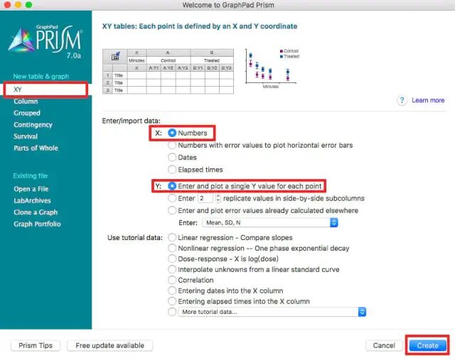 2. 新建pzfx文档,选择XY(X为默认Numbers,Y选择Enter and plot a single Y value for each point),点击create