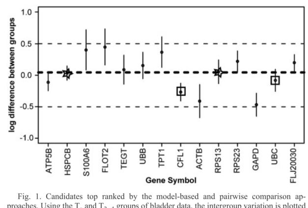 在Bladder数据集中,我们发现,排列前面的2个内参基因是HSPCB与RPS13,也就是Figure 1中的内容,如下所示: