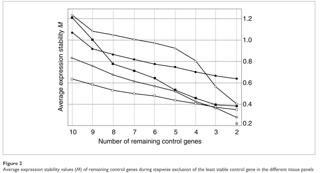 第一步,我们计算所有内参基因稳定检测值M后,排除那些M值最高的内参基因;