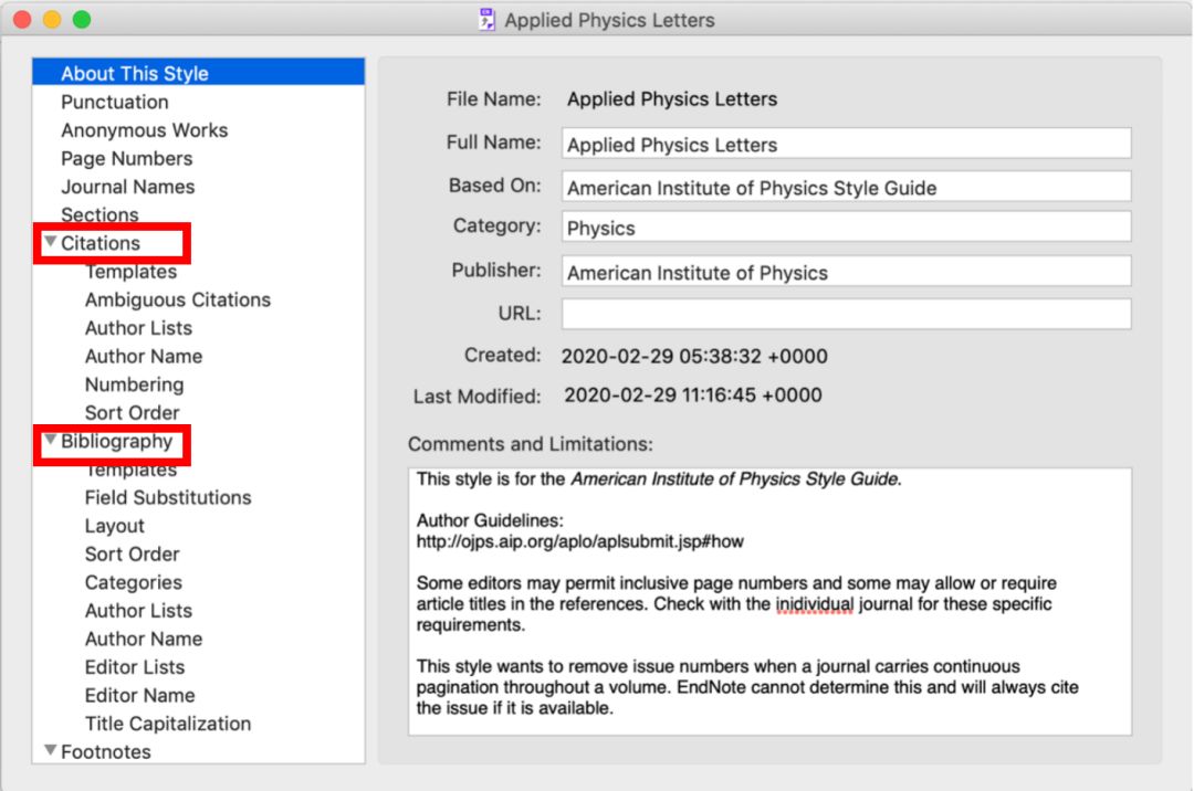 打开“Edit Applied Physics Letters”,显示出APL的各种信息,如下图所示。其中,一般需要修改的就是“Citation”和“Bibliography”这两项。
