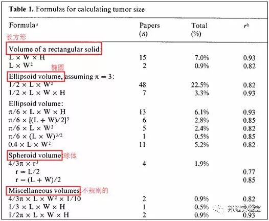 由于肿瘤形状很不均一,衍生了很多体积测量公式(结合下表):