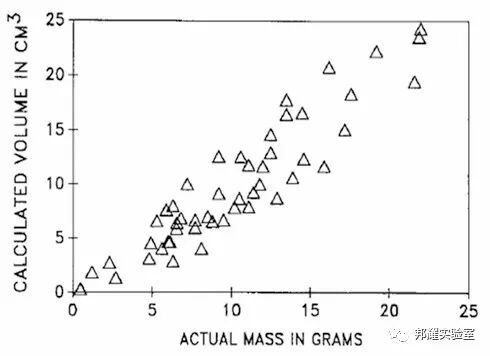 学者选取了50个质量介于0.46g—22.0g之间的裸鼠皮下肿瘤组织样本,结合了文章发表的19个体积计算公式,并通过排水法,计算出肿瘤组织的真实体积或质量。通过对各种方法的对比,发现以椭圆球体计算V=π/6×L×W×H的体积与排水法得到的最接近(r=0.93)。