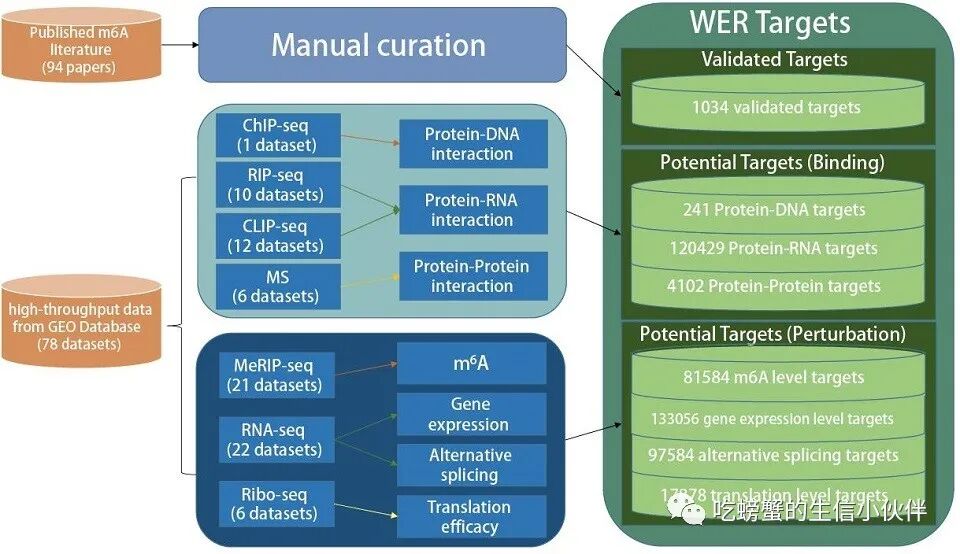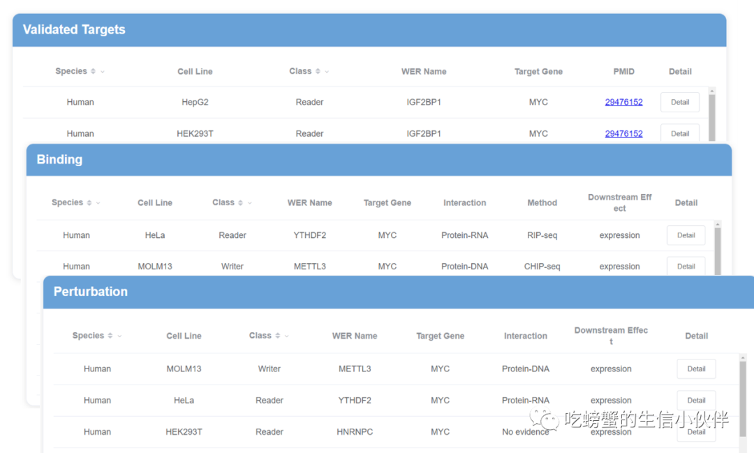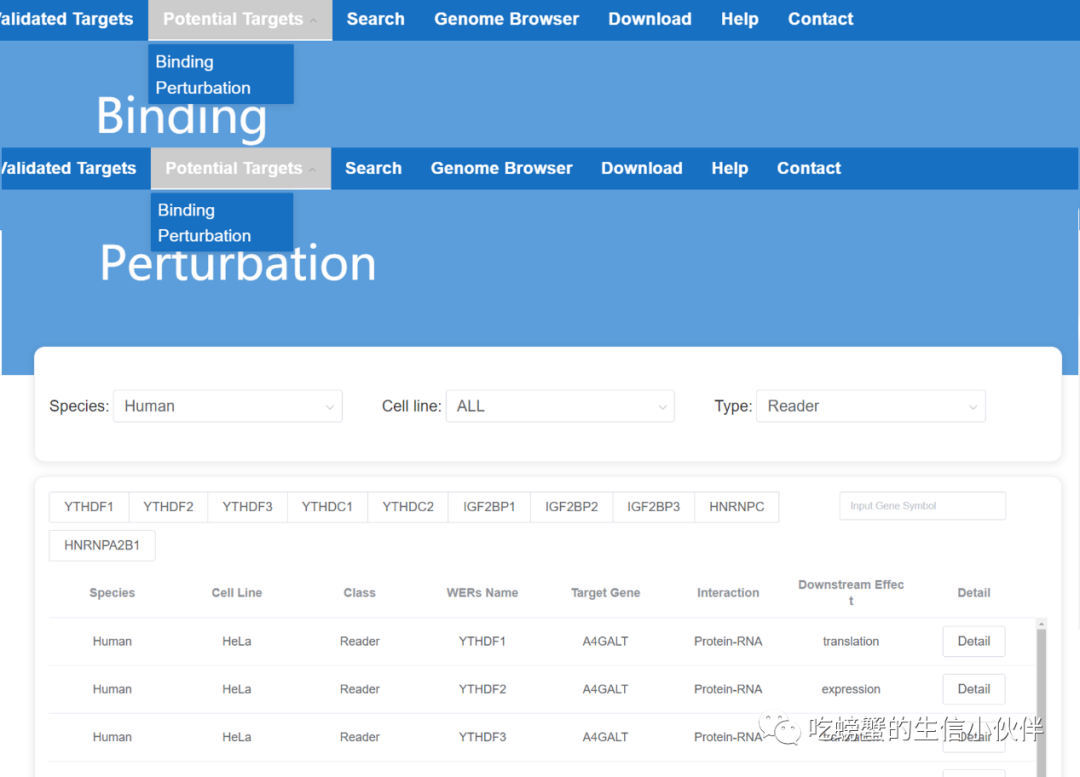 首先是与m6A WER有相互作用的测序数据分析整理为Binding,其中包括RIP-seq和CLIP-seq数据研究的蛋白与RNA的互作,ChIP-seq研究的蛋白与DNA互作以及通过Co-IP的方式打质谱鉴定蛋白与蛋白互作;而第二类则是收集了Ribo-seq, RNA-seq, Merip-seq等数据中由于WER绕动(比如敲除、敲降、过表达和突变等)导致下游m6A水平、基因表达水平、可变剪接或者翻译效率发生改变的WER,作为潜在靶基因,整理为Perturbation。其中Binding是直接证据,Perturbation是间接证据。结果表格除了m6A WER以及靶基因,还有对应的测序方法相互作用类型或者对下游的影响类型。