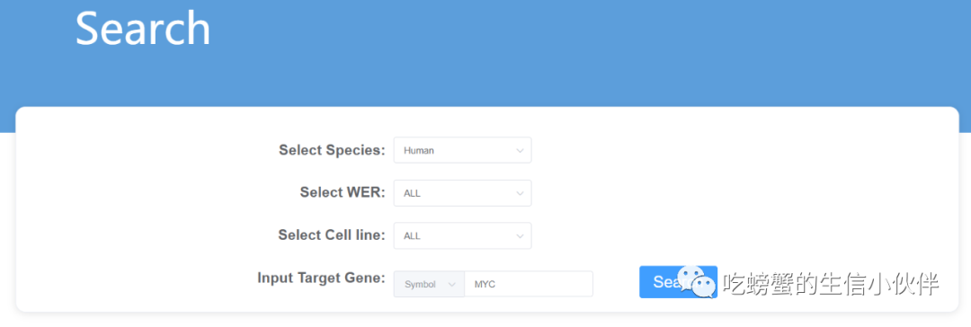 搜索模块。选择物种和细胞系,输入基因,就可以查询这个基因是否存在已经验证的靶基因或者潜在的靶基因。如图在输入框中直接输入MYC,则可以获得与人类物种中所有实验验证和通过数据分析预测的把MYC作为靶基因的结果,方便快捷且实用。