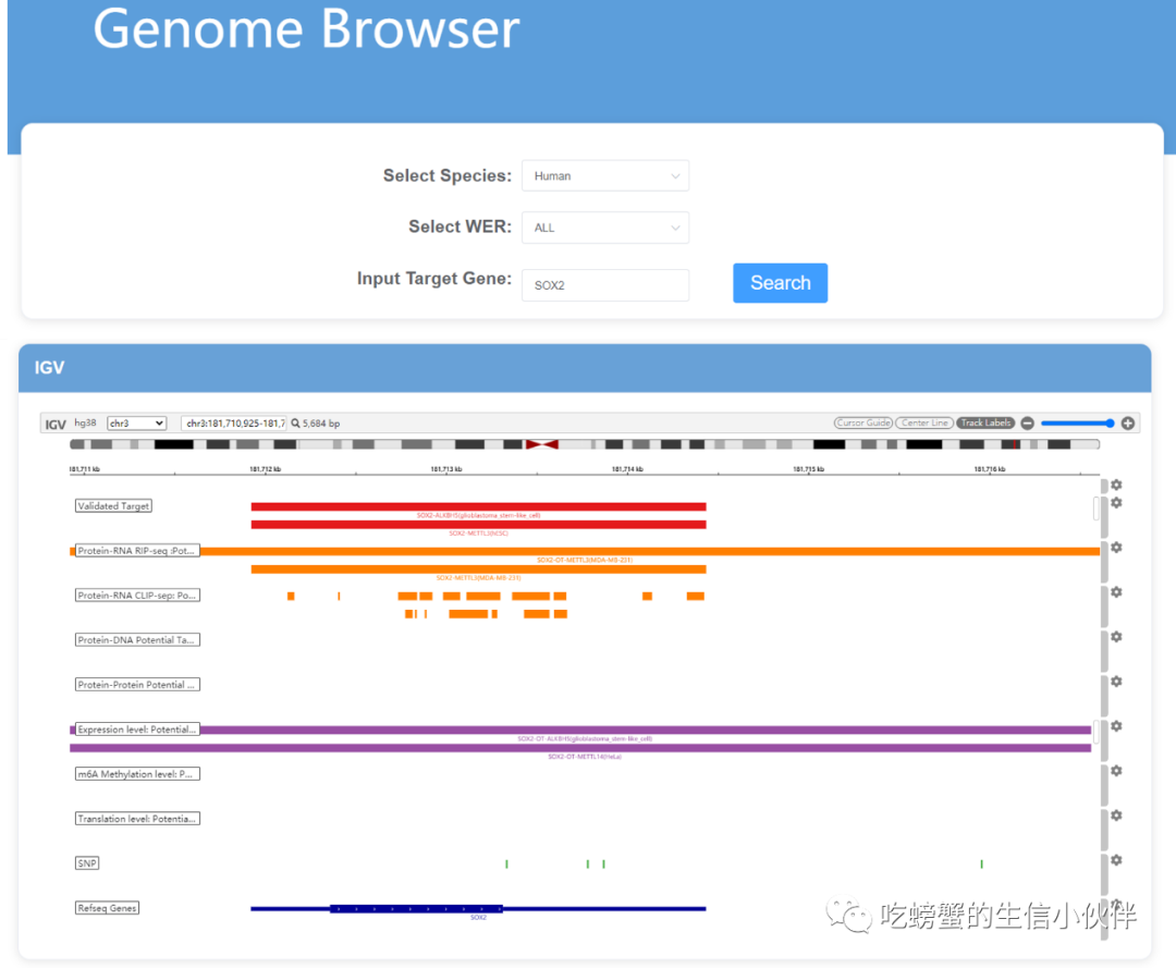 Genome Browser模块中,输入基因即可展示靶基因的各个测序数据在基因组中的位置情况。如图,输入基因SOX2,不但展示了实验验证结果在基因组中的位置情况,还展示了在RIP-seq、CLIP-seq等实验结果中SOX2与WER与SOX2相互作用的区域。同时还提供了SOX2基因上的SNP位点。