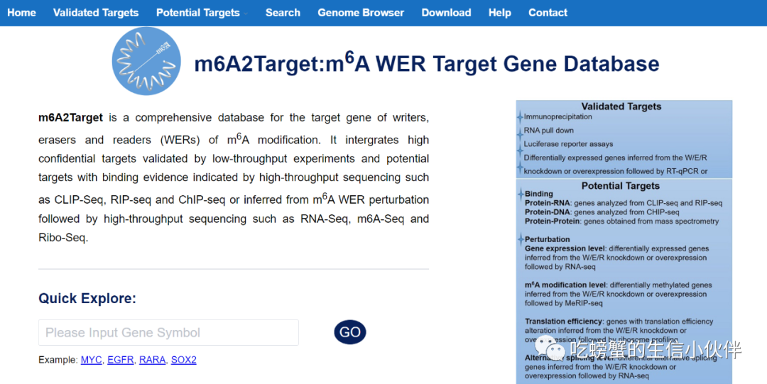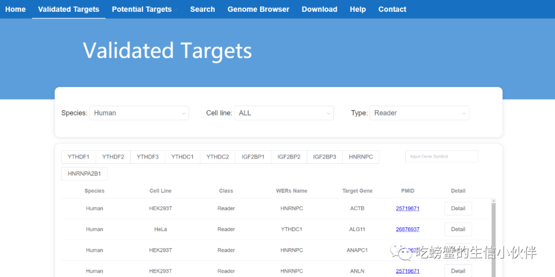 Validated Targets模块,储存了实验验证部分的m6A WER靶基因,包括免疫共沉淀、RNA pulldown、荧光素酶报告基因系统、敲低或过表达并得到qPCR的验证等,用户可以通过此模块查询是否存在已经实验验证的m6A靶基因。