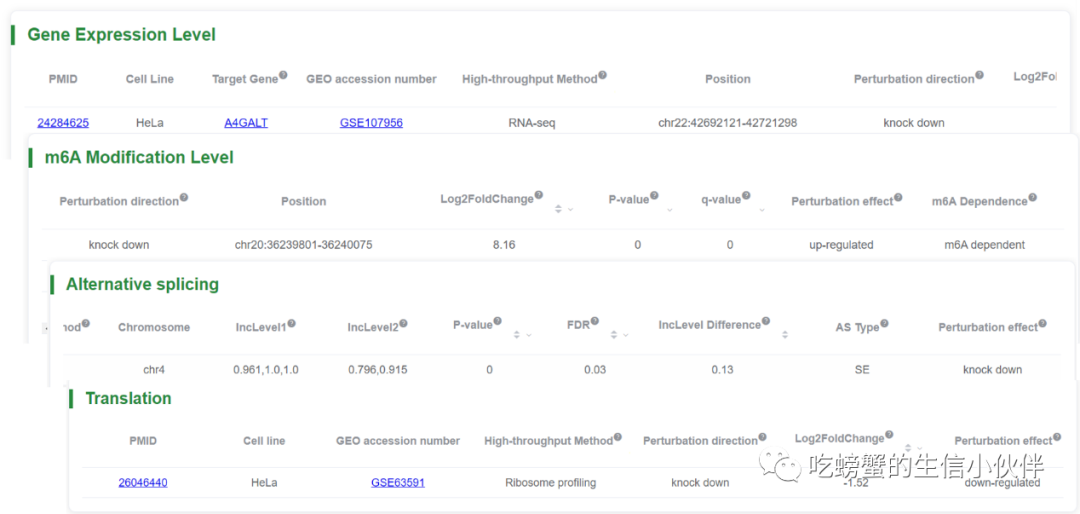 而在Perturbation的详情页面中,则可以分别查看导致下游基因表达水平、m6A甲基化水平、可变剪接和翻译效率中的靶基因具体改变情况,如具体的细胞系和样本、差异表达、差异甲基化或者差异翻译效率的具体差异结果等。