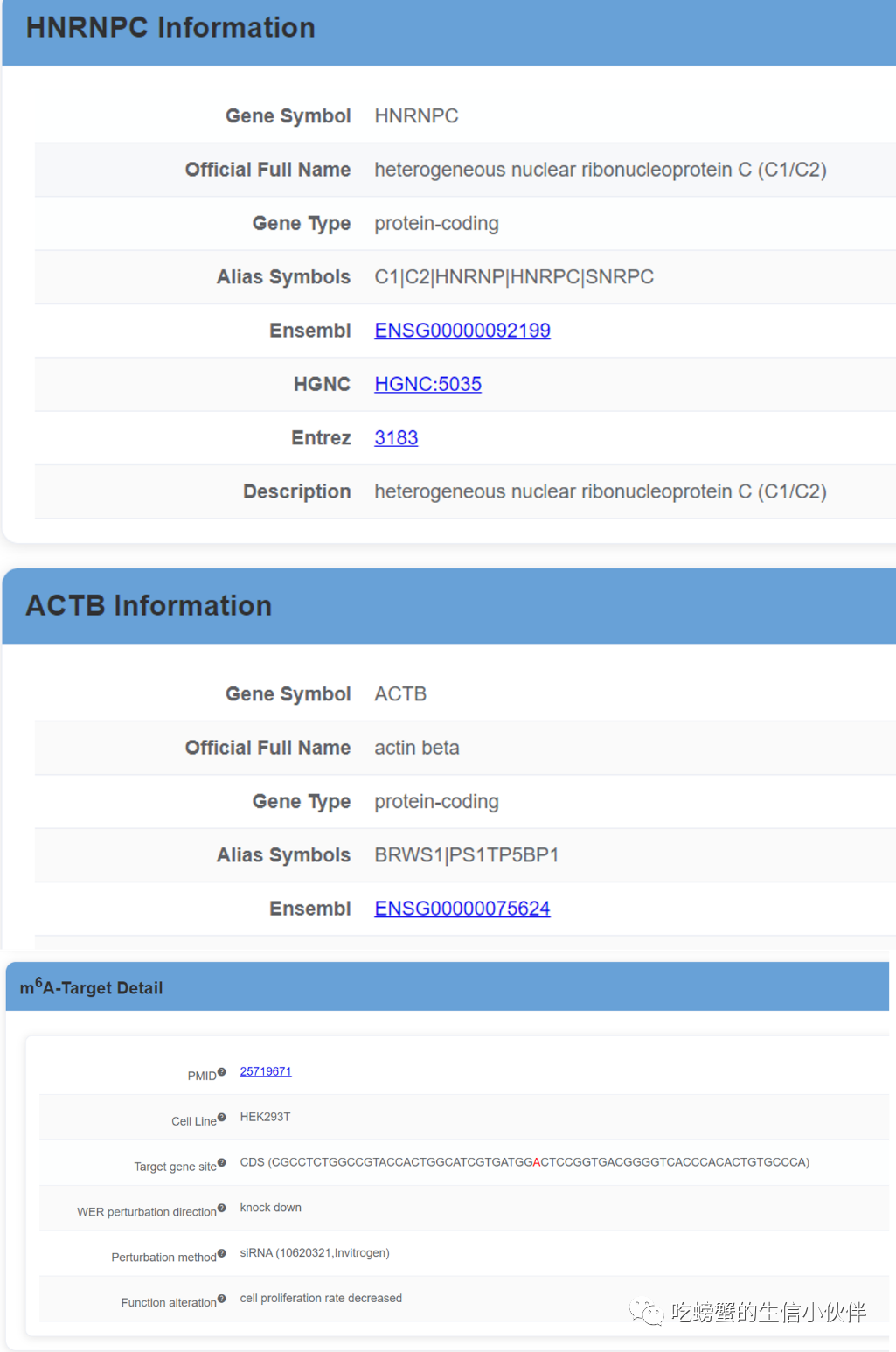 点击对应表格中对应行的Detail按钮,则可以进入详情页面。如图包含HNRNP 这个m6A及其靶基因ACTB的具体信息:如Ensembl ID,HGNC ID,Entrz ID,基因类型与基因的描述。同时还提供了各个类型基因ID对应数据库的跳转链接。同时下方还有HNRNPC与靶基因ACTB之间具体的相互作用信息,如对应文章的PMID,具体的细胞系,预测的靶基因位点,实验方法,测序方法以及对功能的影响。