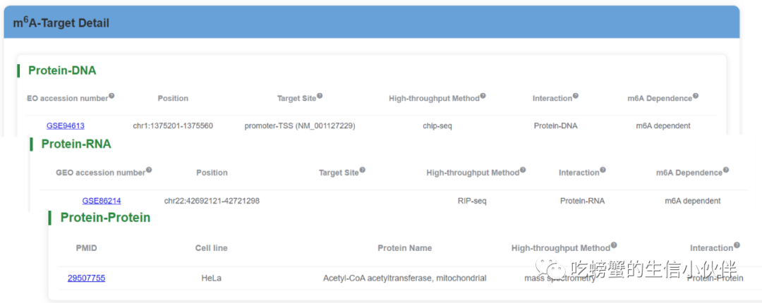 在Binding的详情页面中,则可以具体查看不同的相互作用(Protein-DNA,Protein-RNA和Protein-Protein) Target位点的具体信息,如细胞系,GEO accession number,Target位点,高通量测序方法,相互作用类型等。