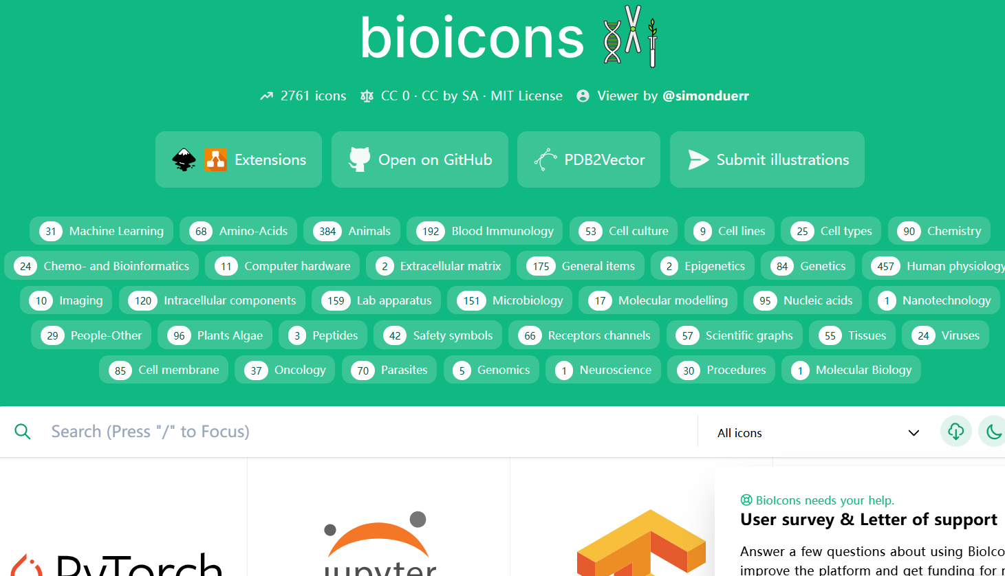 - 开源免费授权灵活:无需注册或付费即可下载使用;Bioicons图标采用 Creative Commons 系列许可证如 CC0、CC BY SA、MIT 等,允许商业和个人无偿使用,但需按许可要求标注原作者。